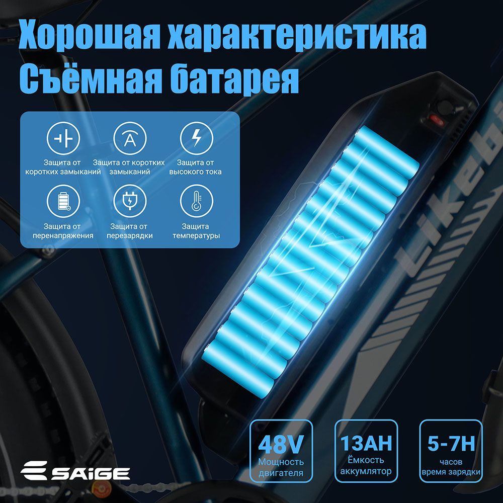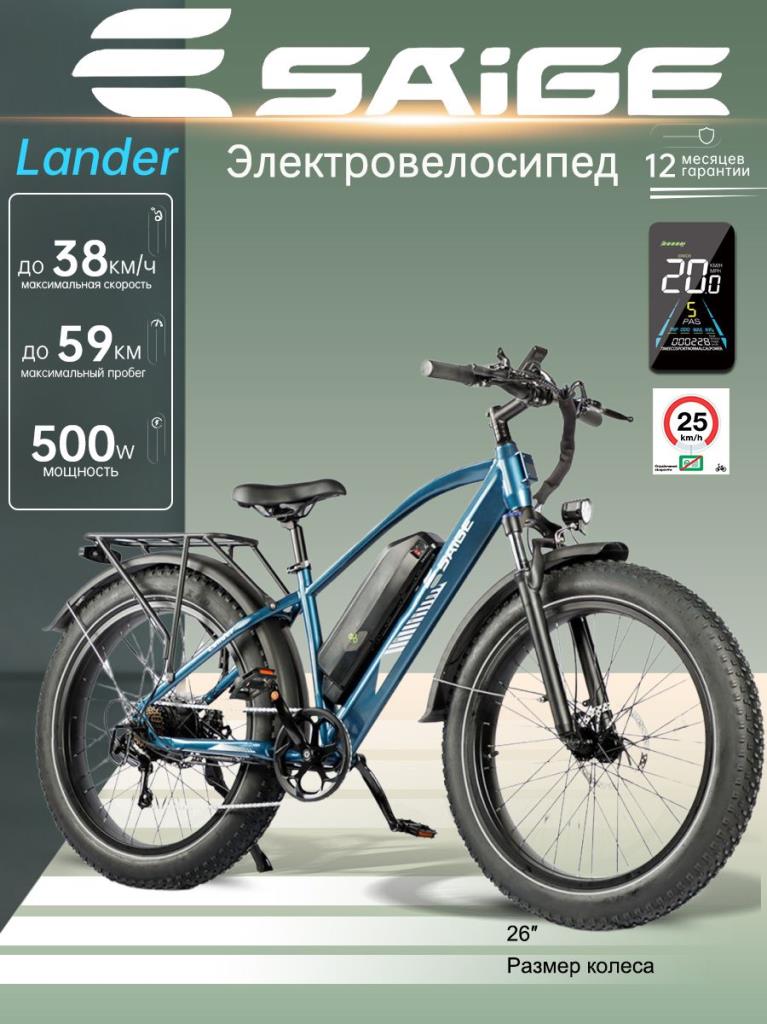 Электровелосипед для взрослых SAIGE Lander 500W 38 км/ч Батарея 13Ah Запас хода 59 км Колеса 26" Дисковые тормоза, синий