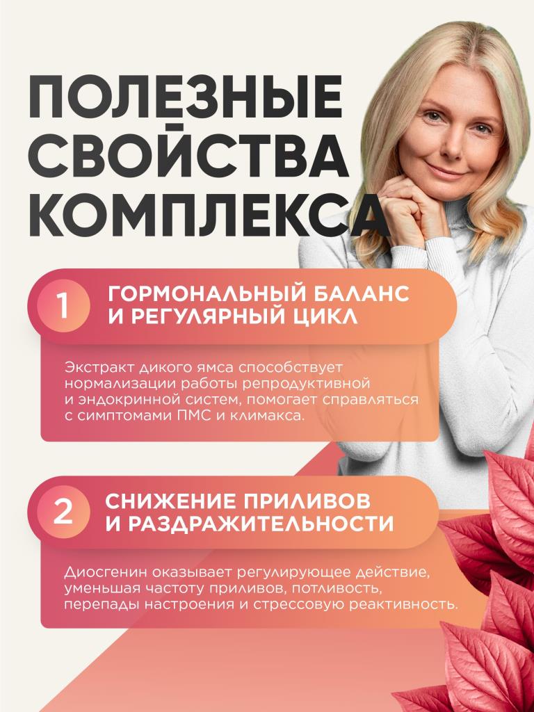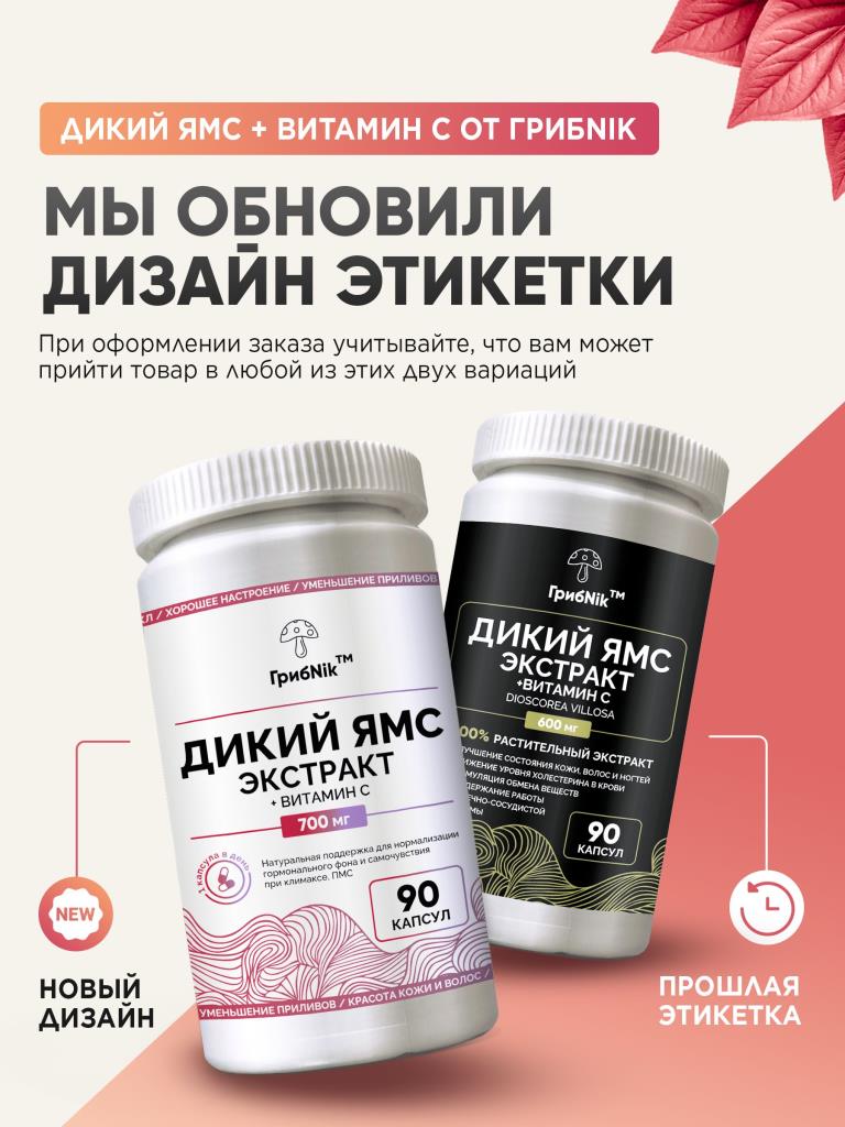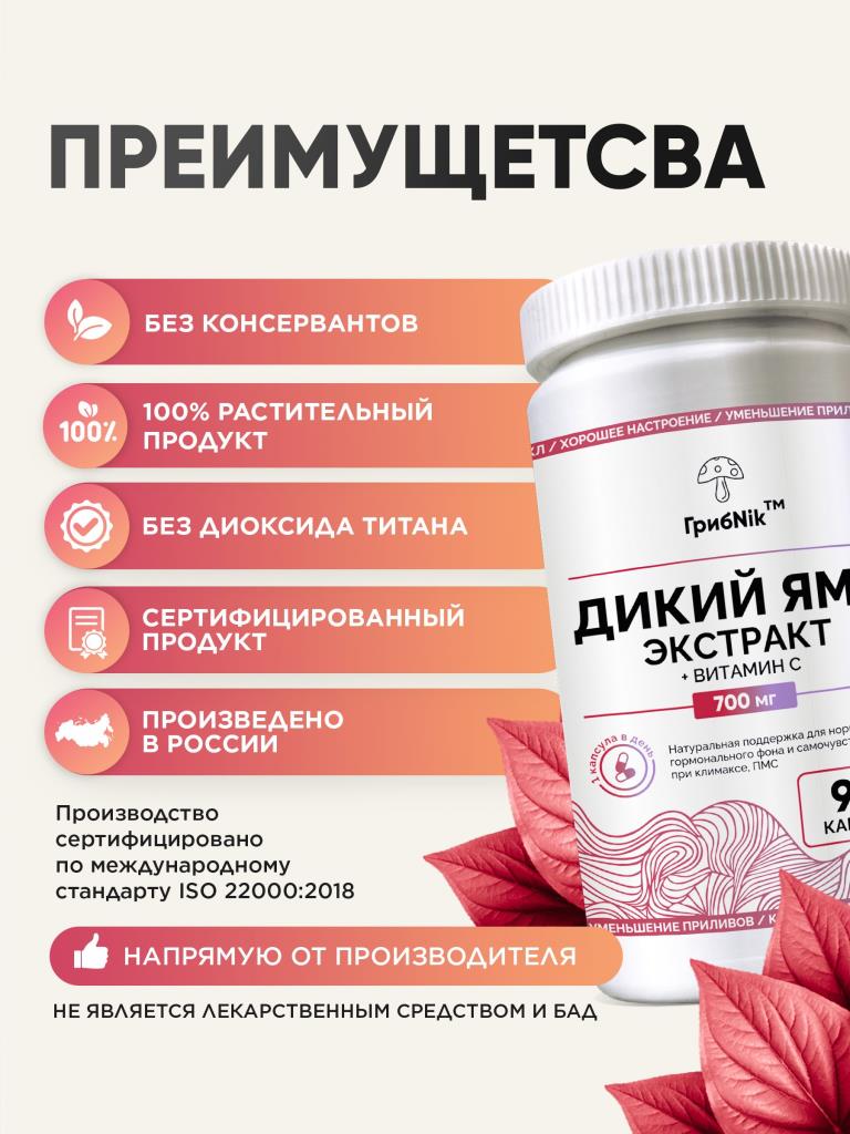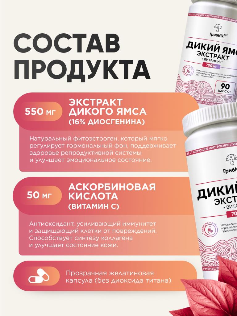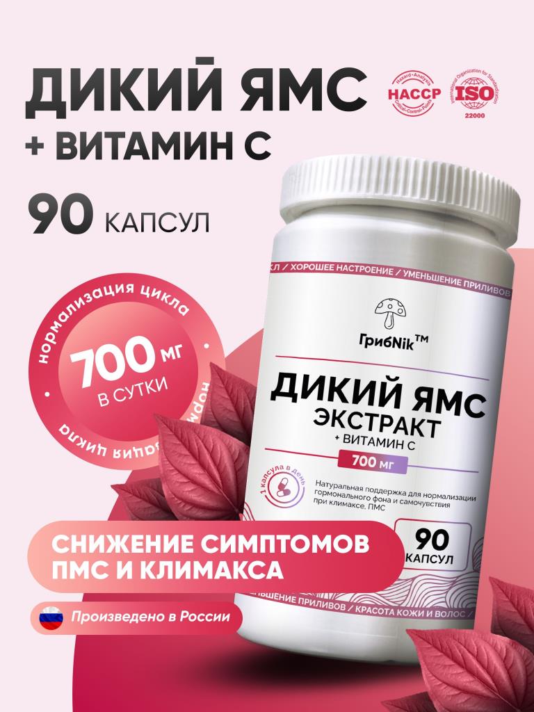 Дикий ямс + витамин С для женщин при климаксе, при пмс, приливах, менопаузе, для либидо, фитоэстрогены, экстракт диоскорея 90 капсул 600 мг, ГрибNik