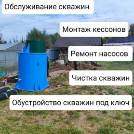 Произведём обслуживание скважины, диагностику, очистку скважин от ила и песка для дальнейшей эксплуатации. Замена насосов, обратного клапана, тросов, оголовков. Поставка, установка, замена фильтров для воды ( водоподготовка) монтаж колб, картриджи различных видов, гидроаккумуляторов.
