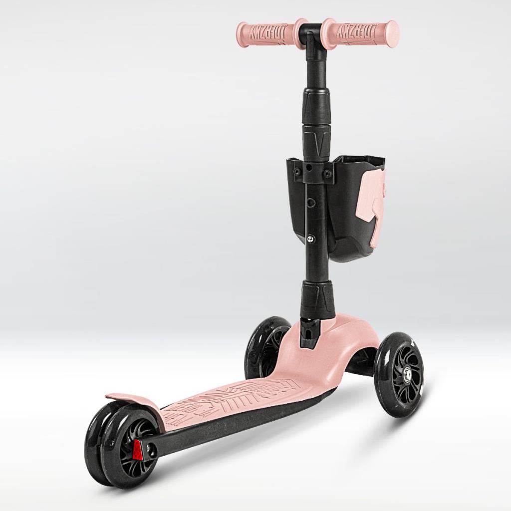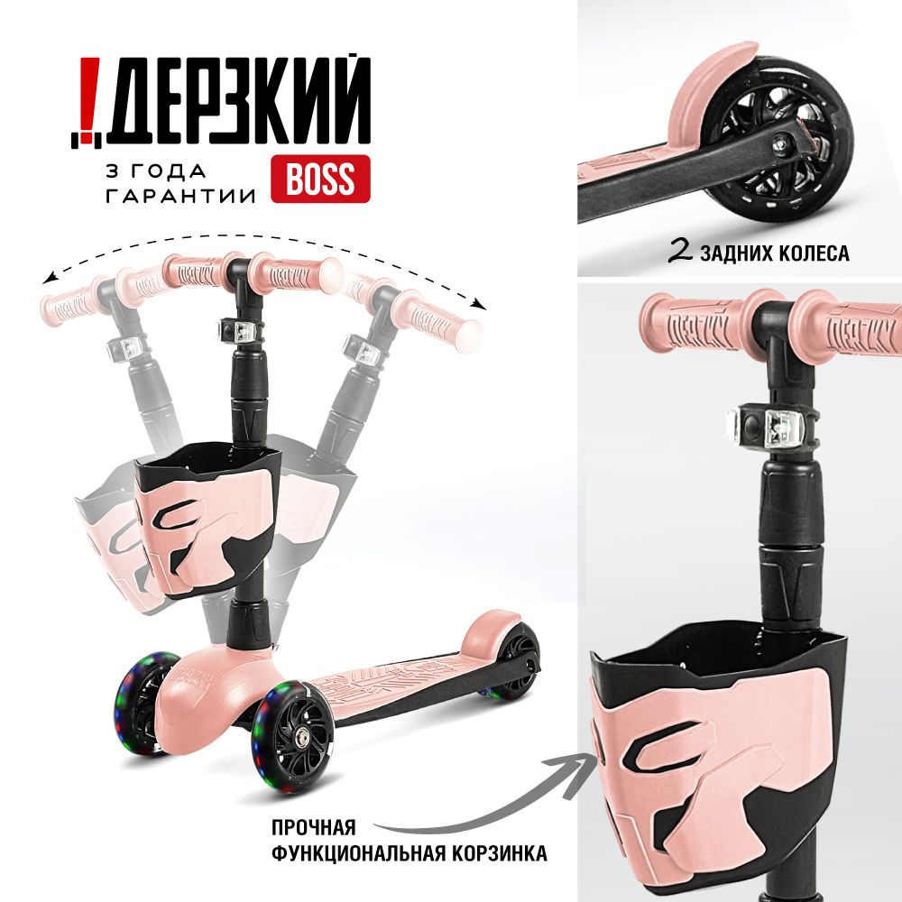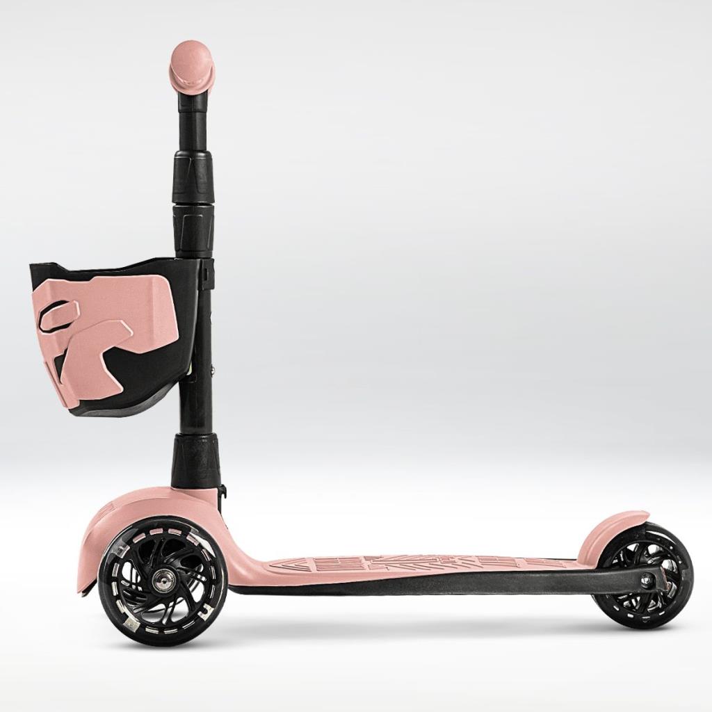 !Дерзкий Самокат трехколесный детский, светящиеся колеса с корзинкой и фонариком., светло-розовый