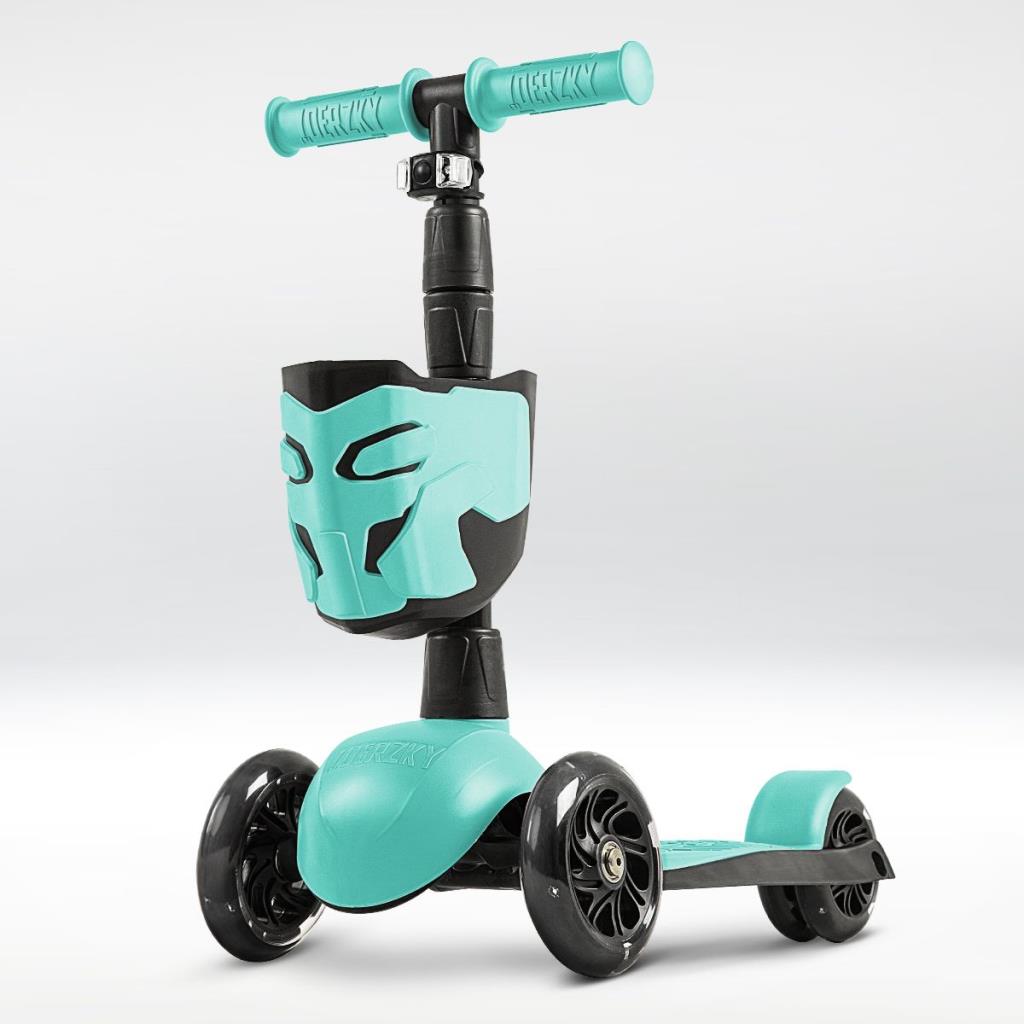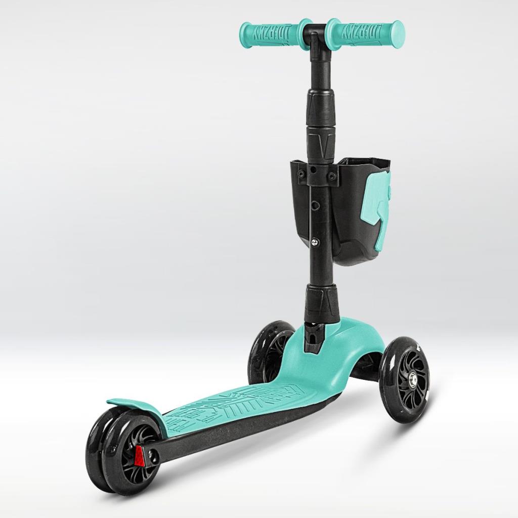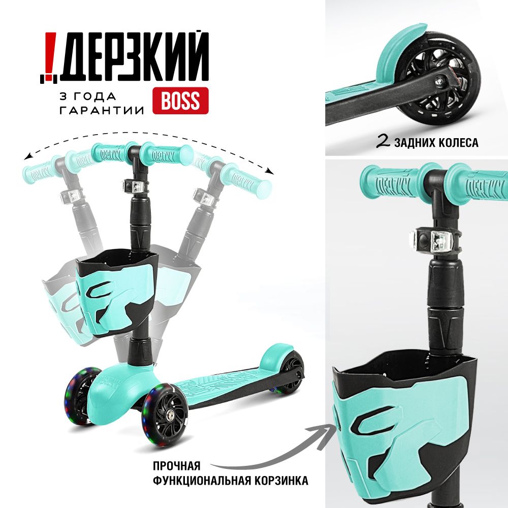 !Дерзкий Самокат трехколесный детский, светящиеся колеса с корзинкой и фонариком., бирюзовый
