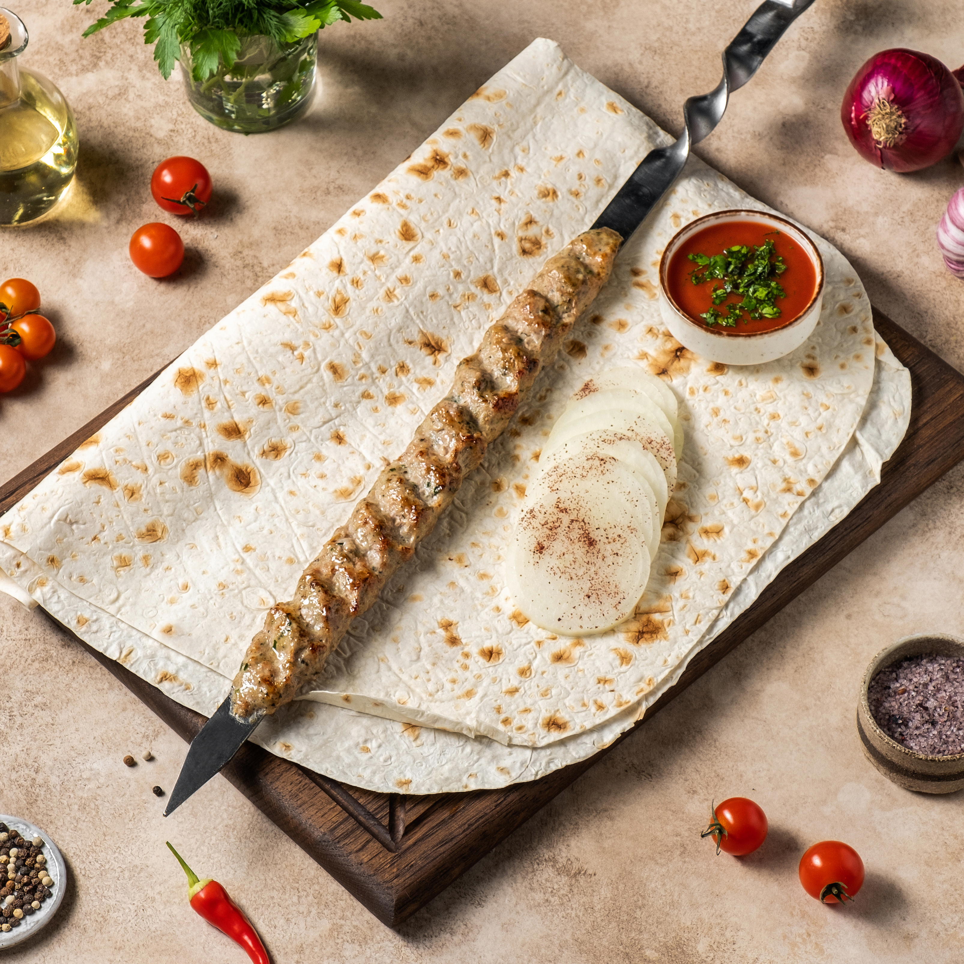 Состав: Люля-кебаб из свинины, лаваш, лук СОУС ПРИОБРЕТАЕТСЯ ОТДЕЛЬНО Вес: 150/30/30 гр.