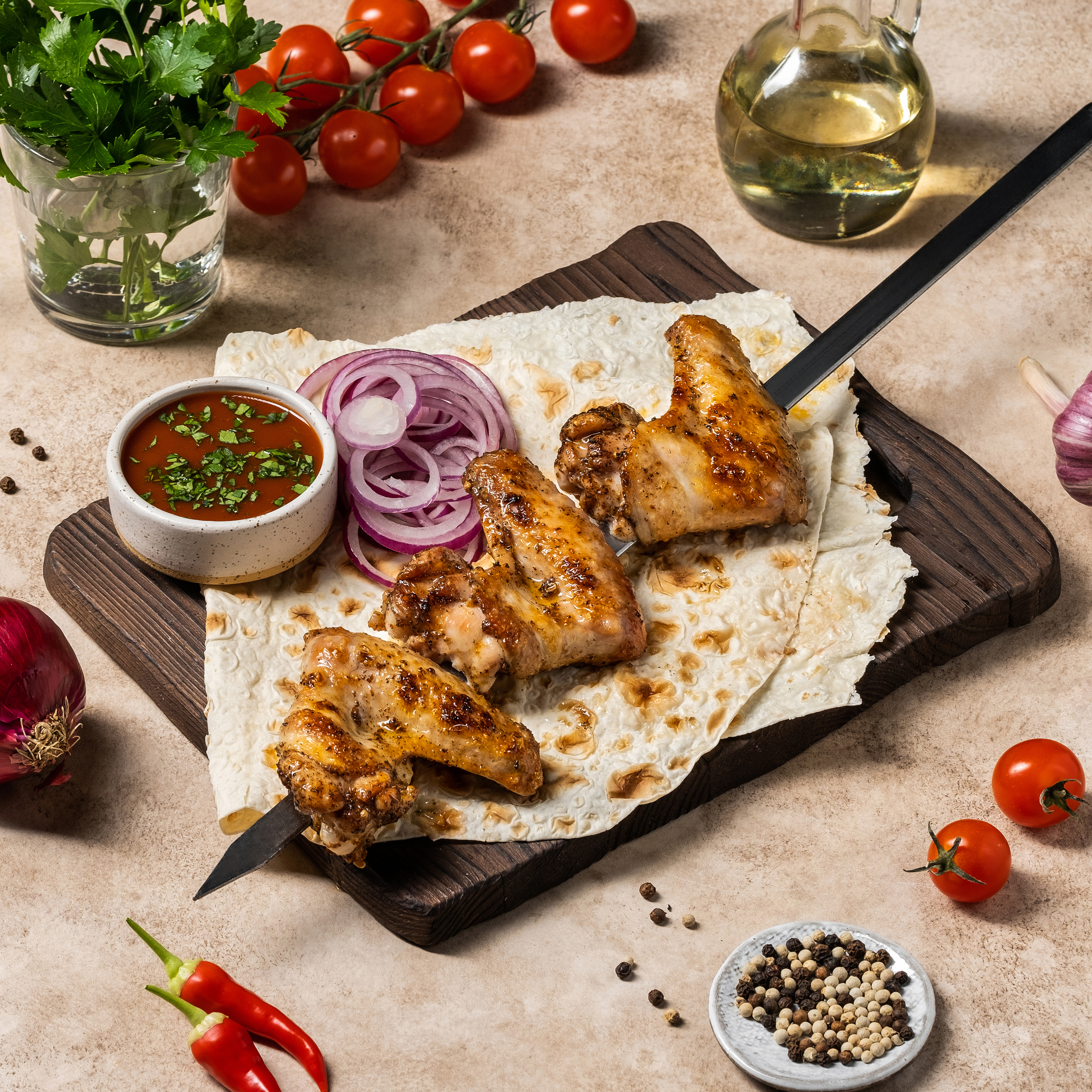 Состав: Крылья куриные, лаваш, лук СОУС ПРИОБРЕТАЕТСЯ ОТДЕЛЬНО Вес: 250/30/30